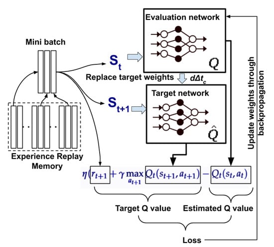 Structure of neural network-based reinforcement learning used to approximate Q-value. A two network strategy (evaluation network and target network) is used. An experience replay memory is also shown, which is used to store the tuples and extract the mini-batch of tuples for training the evaluation network.