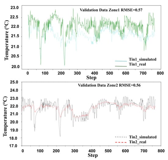 Model validation results for the developed building simulation. The indoor temperature simulated by the model and the actual temperature for both of the zones (upper panel: zone1, lower panel: zone2) is shown along with the RMSE values.