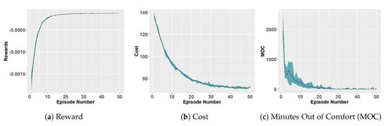 During the training phase, i.e., phase 1, we observed the convergence of the reward, overall cost of the HVAC operation, and comfort violation over the training iterations. We repeated the training process with various values of the parameters mentioned in Table 2 until we obtained the satisfactory performance. Here, we present the training performance of the RL model which showed the satisfactory performance and discuss its convergence. Figure 7 shows three plots showing the training efficiency in terms of reward (Figure 7a), cost of HVAC operation (Figure 7b), and minutes outside comfort (MOC) (Figure 7c). As mentioned earlier, we repeated the training for 50 episodes where every episode had 61 days. During training, we collected the average reward per episode, total cost of HVAC operation for an episode, and total minutes for which the indoor temperature in both the zones were out of the range comfort (MOC) (i.e., above cooling setpoint+AC’s dead band value) for an episode. We repeated the training procedure five times, every time with different seed values for the random initialization of the neural network parameters. In this way, for each episode, we collected five values for average reward per episode, total cost, and total MOC.