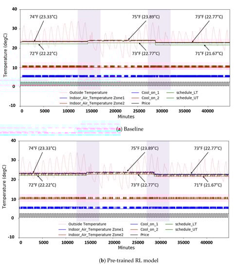 For the purpose of visualization, we present the temperature variations graph for the variable setpoint scenario (i.e., fourth column of Table 3) both using the pre-trained model and the fixed cooling setpoint. Figure 8 shows two plots out of which the first plot (Figure 8a) shows the indoor temperature variations for the fixed cooling setpoint and the second plot (Figure 8b) shows the indoor temperature variations due to the decisions made by the pre-trained RL model. This validation experiment represents a scenario of a variable schedule where, for the first ten days, the homeowner sets the cooling setpoint to 74 °F, for next ten days increased to 75 °F, and for the remaining 11 days reduced down to 73 °F. The difference between the fixed cooling point baseline and the RL operations is that the baseline uses the cooling setpoint to control the HVAC operation, whereas the RL model uses a 2 °F of flexibility range below the cooling setpoint to operate the HVAC such that the price of operation is lower than the baseline while satisfying the homeowner’s comfort. The logic behind this operation is explained in Section 3.3. It must be noted that a larger flexibility range (e.g., >2 °F) would provide greater opportunity for pre-cooling and therefore greater cost savings potential. Similarly, a smaller flexibility range (e.g., <2 °F) would not provide much opportunity on to RL for cost saving.