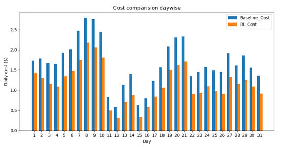 Figure 9 shows the daily cost comparison of the baseline operation and the pre-trained RL model operation for controlling HVAC in the cooling mode. From the graph, it is clear that the RL is saving some money all the days during a month of operation. We observed that the RL-based HVAC control saved ≈25%–30% money per day. This can be seen in Table 3. We also observed that the RL’s operation consumed more energy as compared to the baseline which is consistent for all four setups (refer to Table 3). Moreover, we observed some comfort violations of 97 min for baseline and 79 min for RL-based operation in the fourth setup where we used a variable schedule. For the other three cases, in which we used fixed setpoint throughout the operation, no comfort violation was observed (i.e., MOC = 0).
