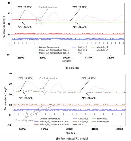 To understand the reasoning behind, (1) RL’s cost saving over the fixed cooling setpoint baseline, (2) RL’s extra energy consumption compared to the baseline operation, and (3) the comfort violations during the variable setpoint setting, we present Figure 10, which zooms into the second shaded region of the Figure 8, where the setpoint was changed from 75 °F to 73 °F. Figure 10a shows the zoomed in view of the baseline plot shown by Figure 8a, and Figure 10b shows the zoomed in view of the plot showing RL’s operation in Figure 8b. We observed that the pre-trained RL model tried to cool down the zones more during the low price timings and tried to minimize cooling during high price timings. This can be observed by comparing the AC status shown by cooling on lines and the price signal in Figure 10b. We highlighted these events as “pre-cooling” as shown in the figure. In contrast, the fixed setpoint baseline performed cooling whenever the indoor temperature was above the cooling setpoint without taking into consideration the pricing information (refer to Figure 10a). This is the reason behind RL’s cost reduction as compared to the fixed cooling setpoint baseline. Furthermore, it can be observed that RL maintains the house at a lower temperature on average compared to the baseline. This results in a larger cooling load on the HVAC system due to increased heat gains through the envelope caused by a larger temperature differential between the indoor and outdoor air. This explains why pre-trained RL model based HVAC control consumed more energy than the baseline as shown in Table 3. This can also be justified by the reward function used for training the RL model (shown in Equation (2)), which uses only cost of operation to penalize the RL-agent. In Figure 10a,b, the region marked as “comfort violation” is where the indoor temperature violated the cooling setpoint. This is the reason behind the MOC values of 79 and 97 min for the RL and baseline’s operation, respectively. We calculated MOC as the sum of the number of minutes the indoor temperature was above the cooling setpoint+the AC’s dead band. It can be seen in Figure 10 that both the baseline and RL control tried to set the cooling setpoint with respect to the changed cooling setpoint (i.e., from 75 °F to 73 °F); however, indoor temperature took some time to cool down, which was reflected as MOC as shown in Table 3 and comfort violation as shown in Figure 10. In the case of baseline, this can not be avoided; however, the RL-agent can use some schedule look ahead to respond to such events by pre-cooling to avoid the comfort violations.