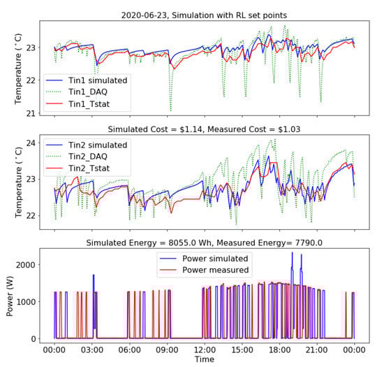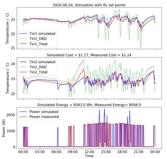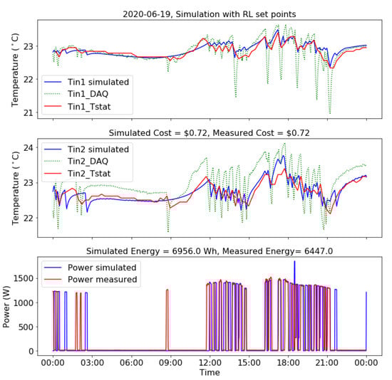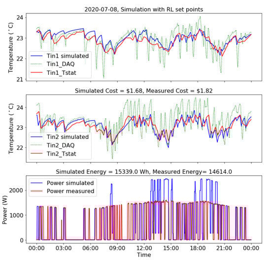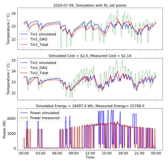 Measured data from RL deployment compared to simulation using RL set points for 9 July 2020.