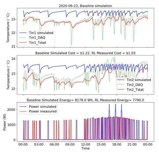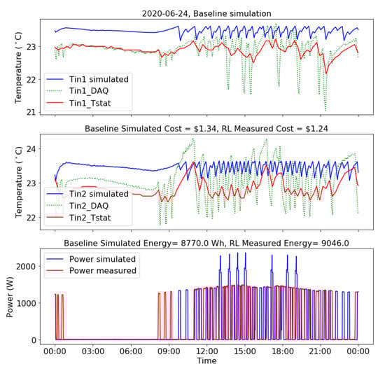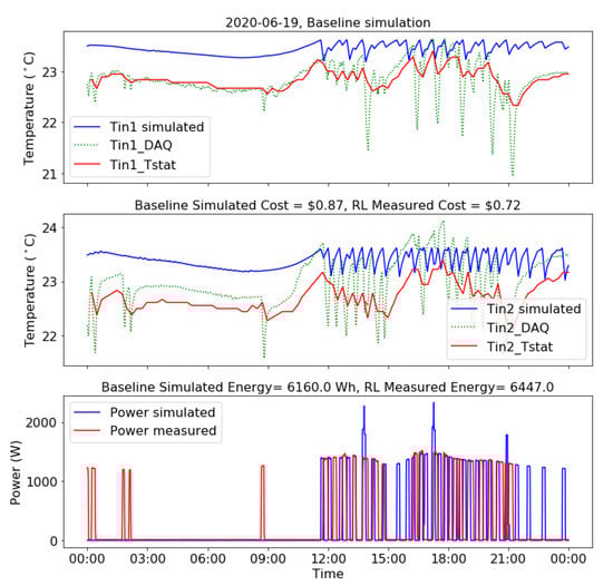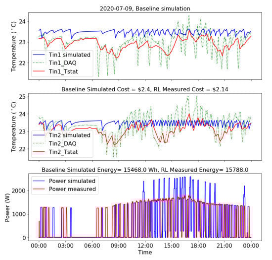Measured data from RL deployment compared to simulation using baseline fixed set point for 9 July 2020.