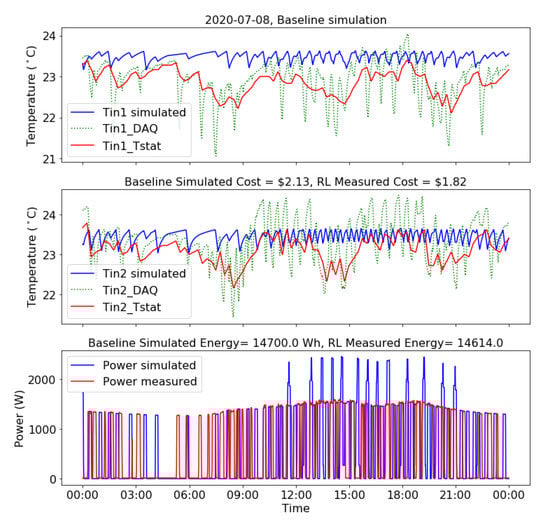 Measured data from RL deployment compared to simulation using baseline fixed set point for 8 July 2020.