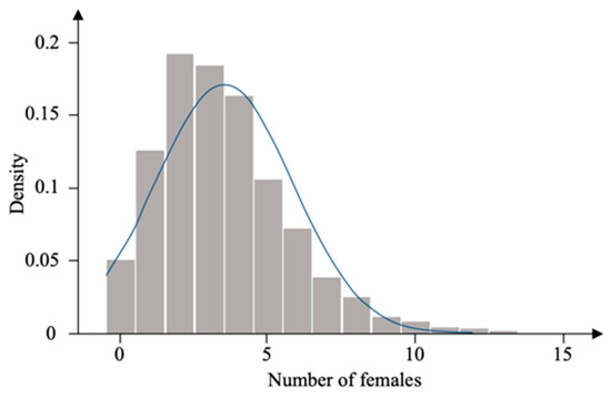 According to Chinese company law, a company’s top management team comprises the board of directors, the board of supervisors, and the senior management team. Therefore, in our study, women in a firm’s top management team included females on the board of directors, females on the board of supervisors, and females in the top management team. To roughly study the effects of women’s presence in a firm’s top management team, we created the variable “female,” which was coded as “1” if there was at least one woman, and “0” otherwise. To precisely study the effects of women’s presence in a firm’s top management team, we calculated the number of females as the independent variable female for a robust test. The distribution of the number of females can be seen in Figure 1. The figure shows that the mean of female top managers was less than 3, including the female top managers from three panels: the board of directors, the senior management team, and the board of supervisors.