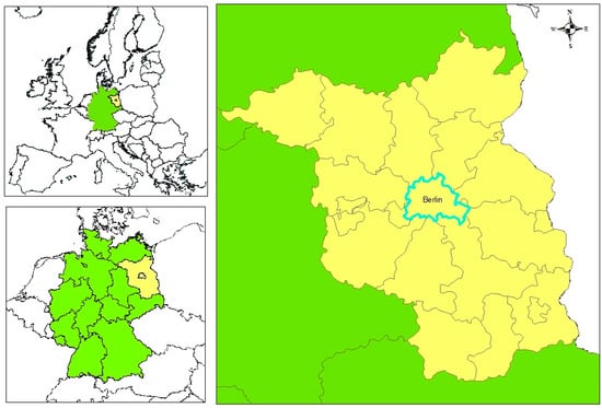 Brandenburg is located in the northeast of Germany (Figure 1), has a population of 2.5 million people, and covers an area of 29,478 km2. It is the fifth-largest German state by area and the tenth most populated. However, it is considered a populated area with very low density, as there are only 85 inhabitants per square kilometer. Brandenburg encircles Berlin—the national capital and city-state—and together they form the Berlin-Brandenburg Metropolitan Area, Germany’s third-largest metropolitan area, and a metropolitan city-region (i.e., foodshed). Brandenburg is formed by 14 districts plus 4 free district cities (Figure 1).