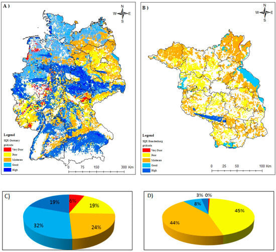 Map of soil quality categories based on the M-SQR index (0–100) for Germany (A) and Brandenburg (B). Soil quality is divided into five classes: (1) of < 20 = Very poor, (2) 20–40 = Poor, (3) 40–60 = Moderate, (4) 60–80 = Good, and (5)> 80 = High. The proportion of soil quality categories in Germany (C) and in Brandenburg (D). Maps of own elaboration based on [51].