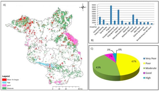 Map of “silage maize for biogas” production based on soil quality in Brandenburg (A), distribution of “silage maize for biogas” in districts of Brandenburg (B), and percentage distribution of “silage maize for biogas” production based on soil quality in Brandenburg (C). Map and figures of own elaboration based on data from the IACS database.