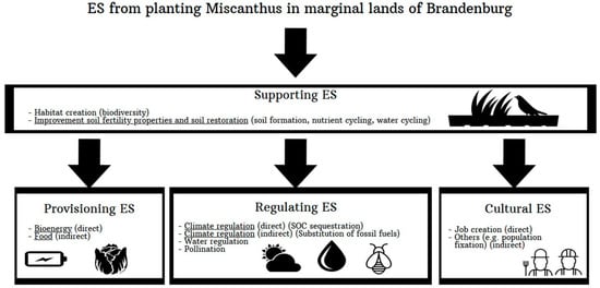 Miscanthus can be a multifunctional crop that not only offers a great amount of energy but also provides and supports other ecosystem services (ES) (Figure 4). In this section, these will be discussed and estimated values will be given for some of them (underlined ecosystem services in Figure 4). In this study, we specifically estimated the energy and food production (provisioning ES), C sequestration, and CO2 mitigation potential of Miscanthus (regulating ES).