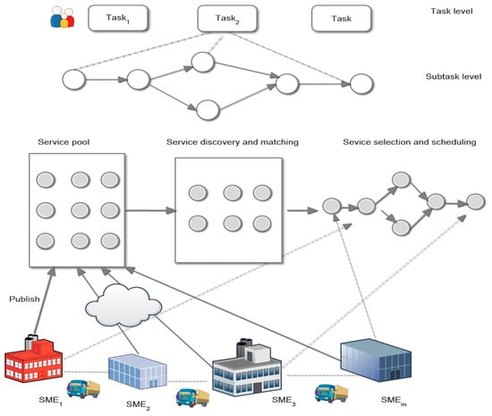 A cloud manufacturing framework consists of a central cloud manufacturing platform, small and medium-sized enterprises (SMEs) offering various cloud manufacturing services, and manufacturing task requests from users, as shown in Figure 1. An enterprise encapsulates its manufacturing services or capabilities, registers them to the cloud manufacturing platform, and then publishes them. All registered and published services are put into the service pool managed by the platform. Once a user submits its manufacturing task to the platform, the task is decomposed into a set of the subtasks with precedence relations. The platform is responsible for discovering and matching candidate manufacturing services for the corresponding subtasks. Then, the services are selected from the candidate service set and assigned to the subtasks. The start and end time of each subtask are determined and scheduled according to the user’s required due date. It is assumed that a task has been decomposed into the subtasks and that services can be discovered and matched in accordance with the well-known method mentioned in the literature. Therefore, our study only focuses on the service selection and scheduling problem.