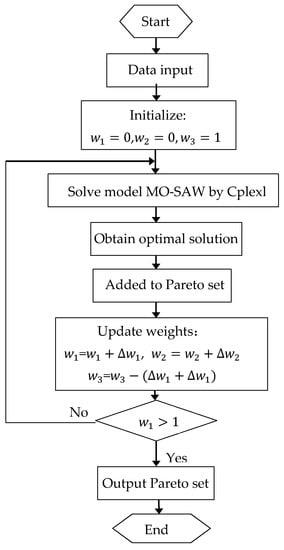 The process of solving the multi-objective optimization model by the simple additive weighting (SAW) method is depicted in Figure 3. The process begins with the initialization of the weights, i.e., . During each iteration, the weights are updated by increasing or decreasing a step size and the model is then solved by the commercial solver Cplex 12.7.0. The optimal solution is added to the Pareto set. When one of weights is larger than 1, the process ends and the Pareto-optimal set is obtained. For the small cloud manufacturing example mentioned above, the Pareto-optimal solutions by SAW with equal step size of weights are listed in Table 4. The coverage ratio is defined as , where is the number of the Pareto-optimal solutions by SAW and is that of the Pareto-optimal solutions by the -constraints method. As shown in the table, the Pareto-optimal solutions by SAW can only obtain seven solutions, i.e., (R1, R2, R7, R8, R11, R14, R18). By contrast, the -constraints method can derive all 18 solution from R1 to R18, which have been shown in Table 3. The maximal coverage ratio achieves its maximal value of 38.89% even if step size of the weights becomes smaller than 0.01. Figure 4 graphically shows all Pareto fronts, i.e., Pareto-optimal points, by both the -constraints and SAW. Obviously, the -constraint approach finds all eighteen solutions and SAW can obtain only seven solutions of these solutions. Therefore, the -constraints method can achieve more Pareto-optimal points and more diverse Pareto distributions than the simple weighted sum approach.