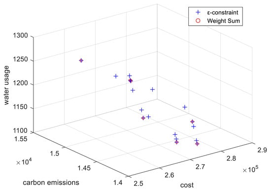 where the objectives , , and represent total cost, total carbon emissions, and total amount of water usage, respectively, as defined in Equations (4)–(6).