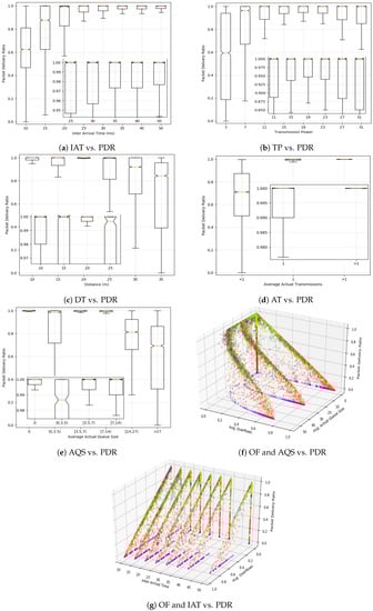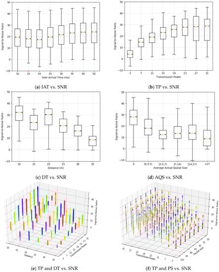 Figure 2a–d describes the relationship of SNR with IAT, TP, DT, and AQS, respectively. The SNR tends to rise with the increase in IAT (Figure 2a) and TP (Figure 2b) values. The rise in IAT indicates lesser traffic and hence potentially improving channel conditions, whereas TP directly impacts SNR. However, when the TP level is too high (23 and beyond), the SNR tends to deteriorate slightly. This phenomenon is observed for PDR as well. The SNR tends to fall with the increase in DT (Figure 2c) values as DT directly impacts SNR. Interestingly, SNR falls with an increase in AQS (Figure 2d) potentially due to more traffic volume caused by increase packet rate and heavy losses.