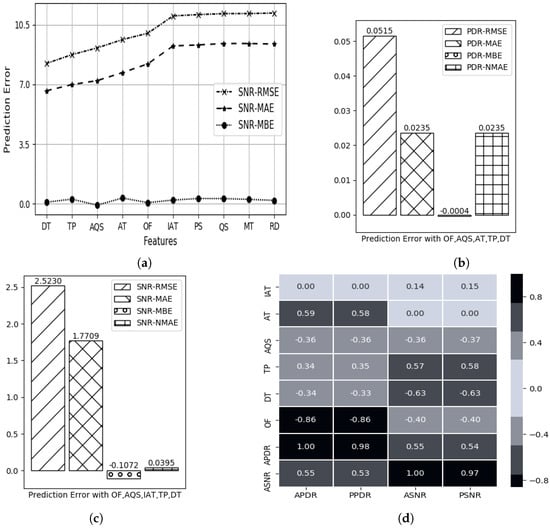 RMSE, MAE, and MBE for SNR against each of the 10 features are shown in Figure 4a. RMSE is higher than MAE, thus indicating the variance of the frequency distribution of the error magnitudes. A value close to 0 for MBE indicates a relatively even spread of positive and negative errors. Prediction results for PDR against individual features have already been presented in []. DNN was trained for the different combinations of features to predict both metrics. The best prediction results were achieved against a combination of five features for both PDR and SNR. In case of PDR, these features included OF, AQS, AT, TP, and DT. Figure 2b shows the prediction results in terms of RMSE, MAE, MBE, and NMAE for PDR against OF, AQS, AT, TP, and DT. In case of SNR, the five features that yield the best prediction result include OF, AQS, IAT, TP, and DT. The RMSE, MAE, MBE, and NMAE are plotted in Figure 2c for SNR against OF, AQS, IAT, TP, and DT. The NMAE is 0.0235 and 0.0395 for PDR and SNR, respectively which indicates good prediction accuracy. It appears that four out of five features for predicting PDR and SNR are the same. The correlation of these best features with the actual and predicted values of both PDR and SNR are shown as a correlation matrix in Figure 4d. It is apparent that OF, DT, TP, and AQS have a strong and similar correlation with Actual and Predicted values of both PDR (APDR and PPDR) and SNR (ASNR and PSNR). Correlations between AT and SNR as well as between IAT and PDR were not calculated as these features (i.e., AT and IAT) were not used in the prediction of these (i.e., SNR and PDR) quantities, respectively. In addition, the correlation is evident among actual and predicted values, and between PDR and SNR. This reaffirms the role of the features in prediction accuracies.