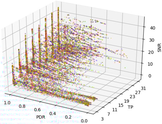 In traditional WSNs, the primary design factor was energy conservation. However, modern deployment scenarios of WSNs pose various conflicting requirements on the QoS, which yields multiple complicated optimization problems []. In this context, data-driven solutions such as machine learning are attracting huge attention from both academia and industry [,]. Reliability is an important requirement in diverse applications with the Packet Delivery Ratio (PDR) being an apt metric. It is well known that the strength of the received signal directly impacts the probability of successful transmissions, so Signal-to-Noise-Ratio (SNR) is critical for reliable communications []. There are numerous studies on PDR in relation to the SNR [,].