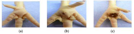 The foot pads (only the central plantar) of the birds were scored at 7, 14, 21, 28, 35 and 41 days on a scale from 0 to 7 in accordance with Mayne et al. [28]: score 0 = healthy skin, score 7 = more than 50% of foot pad area is necrotic (Figure 1). The average scoring of both legs was done for each bird.