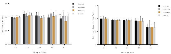 During the trial between days 14–35, there were no significant differences in the DM content of the excreta between the groups (Figure 2). The mean of excreta DM content for all experimental groups at d 35 was about 20.4% ± 0.65. However, excreta DM content (18.3%) at d 41 was negatively affected by feeding SFII-Rye compared to broilers fed the control and SFI-Corn diets (p < 0.05). The viscosity of excreta analysed on a weekly basis is presented in Figure 2. Statistical analysis showed that the excreta viscosity did not differ significantly between the groups during the period between 14 and 41 d. Interestingly, at 41 d, birds fed the control or SFII-Rye diets had the highest excreta viscosity values (2.32 mPas) in comparison to those fed the SFI-Corn diet (2.29 mPas), however, this was not significant.