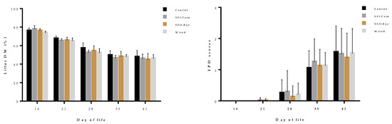 At the beginning of the trial (d 14), the DM content of the litter was about 91.5%. Litter DM content from 14 till 41 d was not significantly affected by the different experimental diets (Figure 3). The control group, however, had the driest litter (47.7% DM) at 41 d of fattening. No significant differences in the FPD scores between the groups were noted (Figure 3). The FPD score with an average score of 1.49 for all groups (end of trial) was good overall, especially considering that scores below 2 are irrelevant from a veterinary point of view. Birds fed the SFII-Rye diet, nevertheless, had the lowest FPD scores (1.38) compared to the other groups.