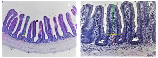 Example image: H&E staining from the ileum (a) and caecum (b) intestinal wall, measuring lines included scale bar 200 and 50 µm, respectively. Green: villus height; yellow: villus width; red: crypt depth.