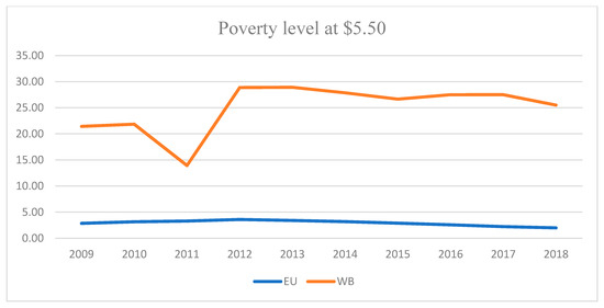 Studying poverty has been difficult since there is no fixed measure for it. While the World Bank is the main source to observe how the poverty level changes in each country, it has also set the international minimum poverty line. This poverty line was revised in 2015, where a person is considered to be poor if they earn under USD 1.90/day [14]. This calculation of poverty is focused mostly on the economic worth of the expenditure by a person. On the other hand, measurements of income are only used in countries where there are no effective metrics for consumption. However, this value seems to be too low to define whether someone is categorized as poor in all countries of the world. As the world grows wealthier and poverty is more concentrated, the World Bank has proposed two higher values of the poverty line, that of USD 3.20/day for lower-income countries and USD 5.50/day for upper-middle-income countries [15]. Hence, since this study considers EU and WB countries, which have been classified as upper-middle-income countries, the authors decided to consider USD 5.50/day as the poverty line.