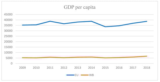 GDP per capita for EU and WB countries, 2009–2018 (Source: Author’s own work).