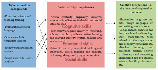 Grounded in what have been reviewed so far, we further defined sustainability competencies as a collection of cognitive, social, and emotional skills that allows using knowledge to create new ideas; stimulate innovations, converting innovations to concrete social/economic outcomes; or at least to solve complex problems independently and creatively during the working process to the rise of the knowledge economy. Our understanding of the interconnections between higher education backgrounds, sustainability competencies, and creative occupation outcomes is shown in Figure 2. It is based on this understanding that we arrived at our empirical investigation and results that are going to be discussed in detail next.