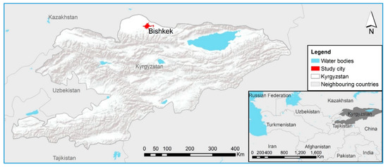 The location of Bishkek, Kyrgyzstan. The shading indicates the mountainous topography south of Bishkek while the city itself is in a flat and semi-flat area. The inset shows the location of Kyrgyzstan within Central Asia (source: Solène Guenat).