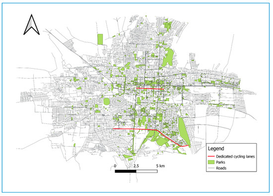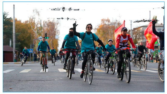Growing air pollution and traffic congestion have contributed to a moderate rise in the popularity of cycling in Bishkek. By the late 2010s, the popularity of cycling had risen noticeably, with more cyclists present on the roads and a number of cycling events held (Figure 2). At present, Bishkek has only 11.6 km of dedicated cycling lanes (Figure 3), predominantly located in parks and/or on the outskirts of the city where the population is less dense and there is more space. Due to the lack of dedicated cycle lanes, cyclists use sidewalks and regular roads. The municipal authorities are currently planning to double the length of the dedicated cycling lanes to 22.2 km by 2021 and build other related infrastructure [43,44]. How extensive the lanes will be and how fast they will be built remains to be seen.