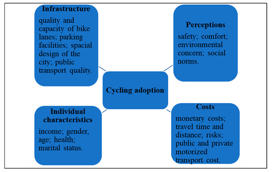 Our explanatory framework for bicycle adoption stems from the theory of planned behavior, which has been refined by several scholars [11,28,45,46,47]. The general framework includes the four major determinants of cycling adoption identified in the literature: Infrastructure, perceptions, individual characteristics, and costs (see Figure 4).