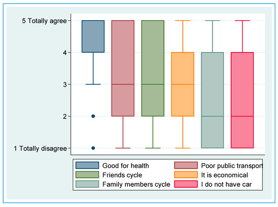 Boxplot of the reasons for cycling based on a Likert scale (1—totally disagree, 5—totally agree).
