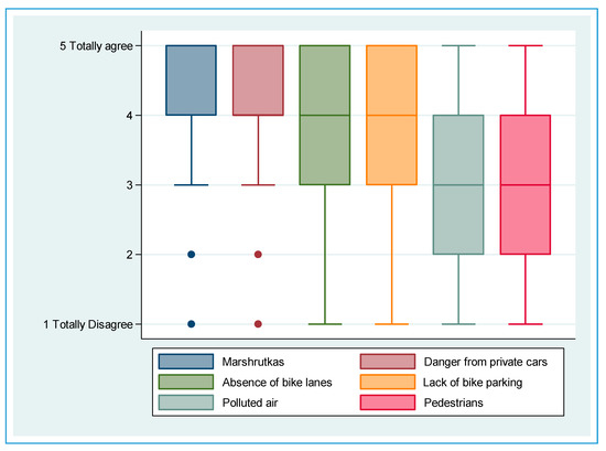Challenges for cyclists. Box plot using a Likert scale (1—totally disagree, 5—totally agree).