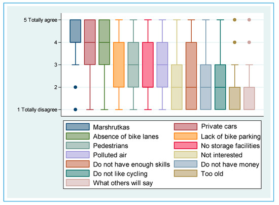 Boxplot of stated barriers for non-cyclists using a Likert scale (1—totally disagree, 5—totally agree).