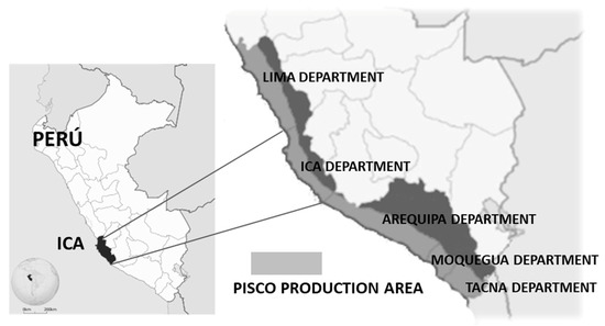 Three hundred kilometers south of Lima, the capital of Peru, is the Ica region (see Figure 1), characterized by its warm climate, grape crops, and the Pisco wineries—a beverage obtained exclusively by distilling fresh musts of “Pisco grapes”—and wines. In the Ica region is the CITE, around which the grape and pisco producers are located. In this region, there are areas with a considerable degree of heterogeneity, by ecological conditions, by economic aspects in the production structure, the availability of production factors, and in market specialization capacities, in addition to access to services and infrastructure for production. In general, a production unit with a growing space, usually called a farm, can have four types of production processes: (1) Agricultural production; (2) livestock production (includes all kinds of animals); (3) product processing; and (4) transactions between the farm and the environment that surrounds it (including all types of buying, selling, marketing, and investment) [68].