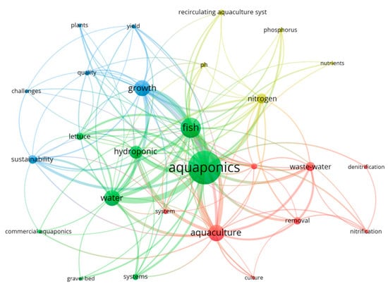 According to the degree of association between keywords, the entire co-occurrence network is divided into four clusters with different colors. Cluster 1 (green) takes “aquaponics” as the hub, mainly focusing on the research of various parts of aquaponics (such as hydroponic). Since water is the carrier of nutrient circulation in system, hydroponic types is an important basis for distinguishing the aquaponics type, tilapia and lettuce are the most common fish and plants in aquaponics research, so keywords “water”, “hydroponic”, “Tilapia”, and “lettuce” are most closely related to “aquaponics”. Cluster 2 (red) takes “aquaculture” and “wastewater” as the hubs. An in-depth study was processed on the water management of aquaponics wastewater, for which “nitrification” and “denitrification” are the main regulation mechanism. Cluster 3 (yellow) mainly focuses on the study of nutrient circulation and distribution. Currently, nitrogen is the most studied nutrient element, and pH is the key factor affecting nutrient circulation. “growth” is the hub of cluster 4 (blue) which mainly discusses aquaponics production [22,23,24]. A series of requirements for system output were proposed, such as growth, yield, quality, and sustainability. In addition, compared with fish, plants are the main object of research in the cluster.