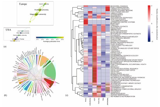 (a) Cooperation network of institutes. (b) Number of publications and cooperation in various countries. (The colors represent different countries) (c) Research areas of top six creative countries.