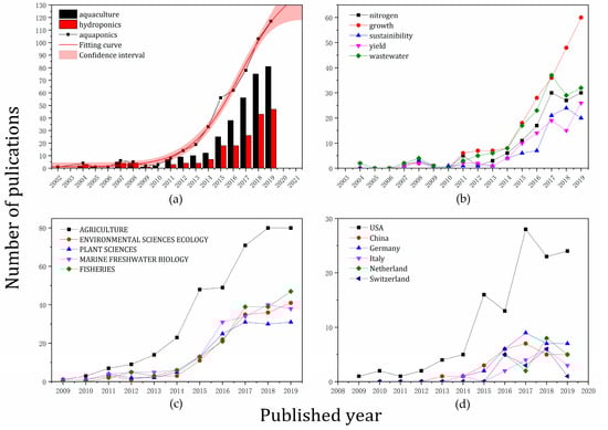 The growth trend of aquaponics research was described through annual changes in publications. There is a significant literature gap regarding aquaponic systems in terms of aquaculture and hydroponic (Figure 5a). To a certain extent, this confirms the view that the system positioning is biased towards aquaculture. Non-linear fitting and simple prediction were performed for the growth trend using the Logistic model (Levenberg–Marquardt algorithm), the fitted curve roughly matches the trend (R2 = 0.9912). The growth trend of publications was in line with the characteristics of the second stage of the sigmoid growth curve. The growth rate of aquaponics research increased sharply since 2010 and slowed down slightly after 2018.A similar situation appeared in publications with “aquaculture” and “hydroponics”.