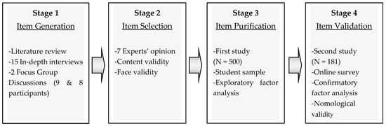 The scale was adapted following Churchill’s [61] suggestions for the scale development process. Figure 1 provides a thorough description of the process that was followed when developing the scale.