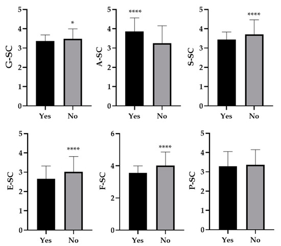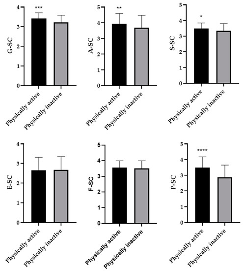 Figure 4 compares groups of physically active and inactive individuals before the lockdown. Being physically active before lockdown was associated with higher levels of G-SC, A-SC, S-SC, F-SC and P-SC. However, no statistically significant differences (p ≥ 0.05) were found for the E-SC dimension.