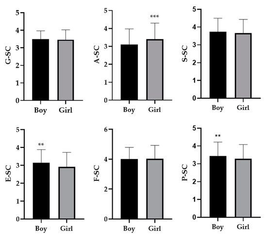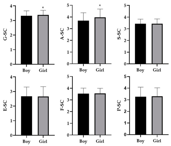 Figure 5 compares groups of physically active and inactive adolescents during the lockdown. Being physically active during lockdown was associated with higher levels of G-SC, A-SC, S-SC and P-SC. However, no statistically significant differences (p ≥ 0.05) were found in the E-SC and F-SC dimensions.