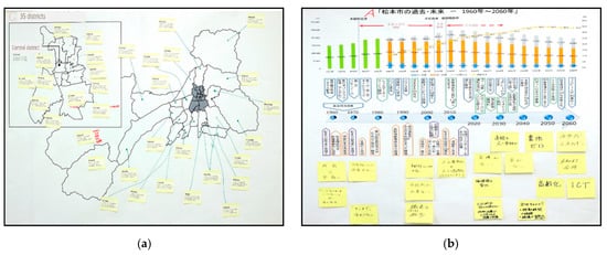 The main work on the second day was to determine a master plan for the city hall renovations, which each group presented in front of all of the participants at the end of the day. The F groups did so as the future generation living in Matsumoto city in 2060, while the C groups did so as the current generation. The details of the process and method that we employed to induce the participants to play the role of imaginary future generation are described by Nishimura et al. [30,31].