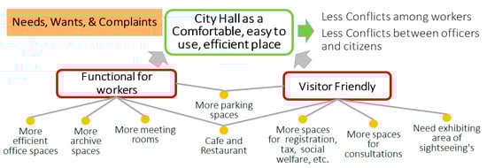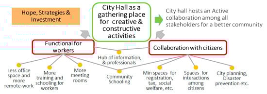 The expressions in the green square at the top center of each figure describe the desirable state of the city hall to be achieved by the renovation. The yellow dot items connected to the left red square are the focus issues for the benefit of the city officers, and the items connected to the right red square are the focus issues for the benefit of general citizens. There are substantial qualitative differences in the focus issues (marked by yellow dots) between the two groups (figures). Most of the focus issues raised by the C groups are ‘demands’, such as asking for more space, more facilities, and more services, which were labeled as ‘needs, wants, and complaints’, as shown in the upper left orange square in Figure 3. In contrast, there are no such ‘demands’ in the focus issues raised by the F groups (Figure 4). Instead, the items from the F groups are more forward-looking and investment-oriented, viewing the renovated city hall as a place for the training and schooling of the community, interactions and discussions among citizens about city planning and disaster prevention, and—most of all—for the coordination of various productive collaborations between citizens and professionals.