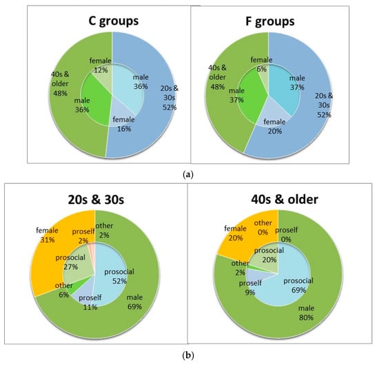 There were 76 male and 28 female adult participants. In total, 46% were in their 40s or older, labelled ‘older’, with 36% among females and 50% among males. Figure 5a shows the corresponding ratios with the distribution of the SVO types based on the first set of questionnaires for the C groups and F groups. Figure 5b shows the distribution of gender with the SVO types within the younger subgroup and the older subgroup. Since the C and F groups were formed randomly, in Figure 5a, there is little difference between the two groups, while the distribution of the SVO typology shows gender and age dependence, as depicted in Figure 5a,b. The ratio of the pro-social type was higher among female than male participants, and was higher among the older participants of both genders.