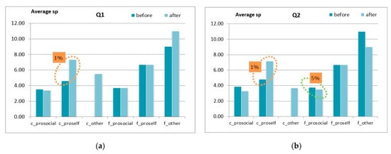 Notably, there was a large difference between before and after the workshops for the pro-self type in the C groups, marked by an orange dotted circle in both panels (Figure 7a,b). According to a t-test, this difference is significant at less than a 1% level, which may suggest a tendency of the pro-self type in the C groups to become even more myopic after the workshops. There was no corresponding tendency found for the pro-self type in the F groups (no indication by a dotted circle means no statistically significant difference in Figure 7.)