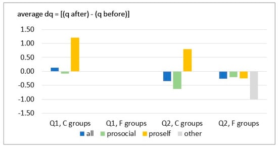 Figure 8 depicts the average dq of Q1 and Q2 in the C groups, as well as in the F groups. The dark blue bars show the average dq of all of the participants; the light green bars are for the s_pro-social type; the yellow bars for s_pro-self type; and the gray bars for s_other type. There are four columns; the left two columns are for the dq data from Q1 in the C groups (the first left column) and in the F groups (the second column). Similarly, the right two columns are for the dq data from Q2 in the C groups (the third) and in the F groups (the fourth). Figure 8 shows a contrasting pattern between the C and F groups, which is mainly reflected in the s_pro-self type (yellow bars), where the average dq of Q1 and Q2 in the C groups are positive, while in the F groups the average dq of Q1 is zero, and the average dq of Q2 is negative. This nominal pattern is consistent with the observation obtained in Figure 7.