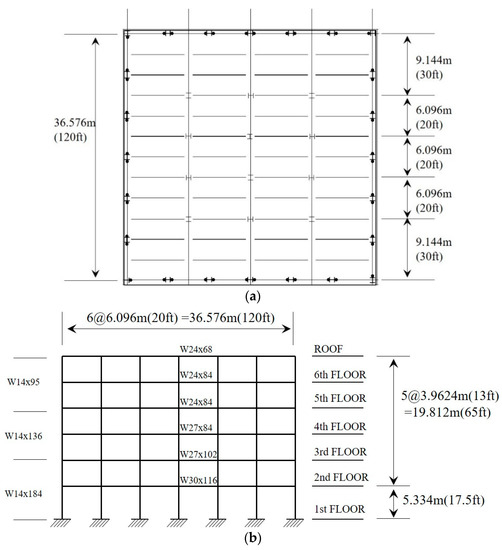 Structural configuration of 6-story residential structure with (a) plan view and (b) typical perimeter frame [9].