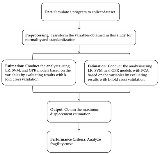 where TSS indicates the total sum of squares, and RSS denotes the residual sum of squares. Additionally, n denotes the total number of data, indicates the at-site estimate for location i, and denotes the estimate derived from the models for location i. Figure 3 shows a simple diagram for the processes used to estimate the maximum displacement and fragility curves.