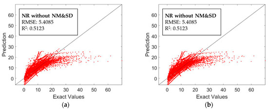 For the analysis of the estimated model, we investigated a relationship between the estimated and observed maximum displacements based on the three models. Figure 4 shows the relationship between the estimated and the observed displacements based on the LR model. Figure 4a presents the results without consideration of NM and SD, while Figure 4b shows the results based on the consideration of NM and SD. To estimate the displacement, all the collected variables were used for model simulations. The RMSE and R2 of LR are 5.4085 and 0.5123 for the model without and with NM and SD, respectively. There are no differences between the two models. Conversely, the RMSE and R2 for SVM and GPR seem to show model performance improvements when the NM and SD are considered in the process. The RMSE and R2 of SVM are 3.6274 and 0.7524 for the model without NM and SD, and 3.6006 and 0.7562 for the model with NM and SD, respectively. The RMSE and R2 of GPR are 0.1118 and 0.9998 for the model without NM and SD, and 0.0769 and 0.9999 for the model with NM and SD, respectively. Among the NR, SVM, and GPR, the GPR model provides the best performance based on the two statistical indices. Figure 5 and Figure 6 show the relationship between the estimated displacement and the observed displacement based on SVM and GPR.