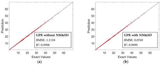 Relationship between the predicted displacement and the observed displacement for (a) GPR without NM and SD and (b) GPR with NM and SD.