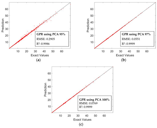 Relationship between the predicted displacement and the observed displacement using GPR with PCA for (a) 95%, (b) 97%, and (c) 100%.
